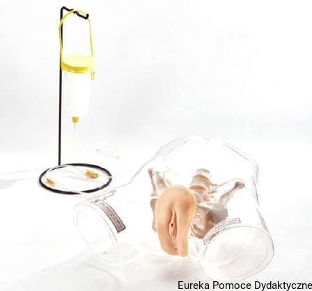 Przeźroczysty model umożliwia naukę cewnikowania pęcherza moczowego z jednoczesną obserwacją wnętrza jamy miednicy, poprawności umieszczenia cewnika balonowego oraz wypływu moczu.