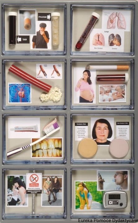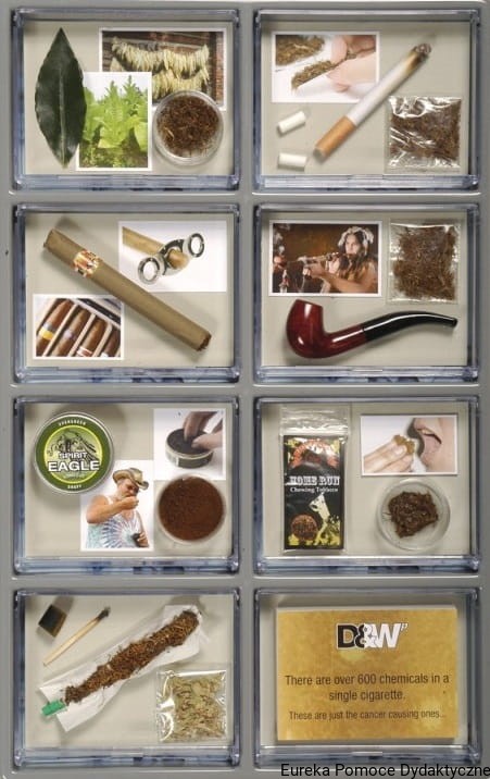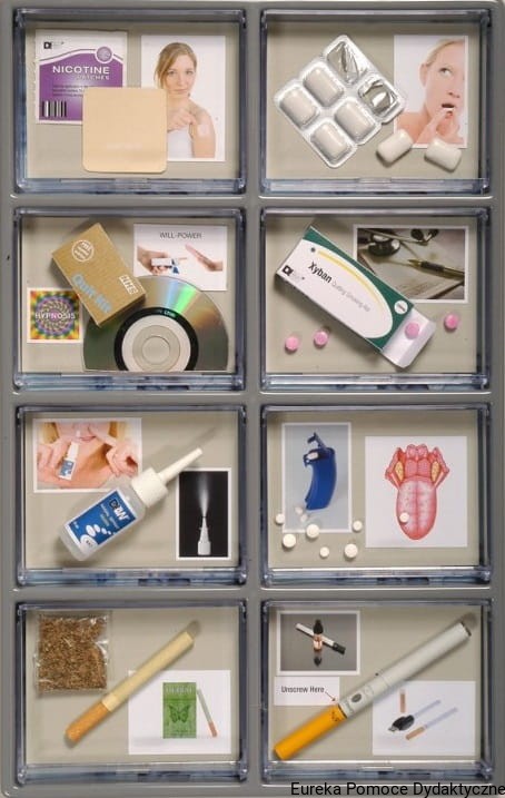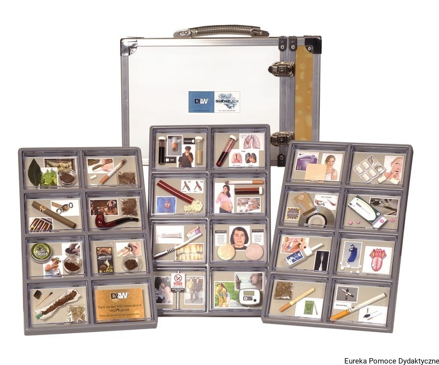 Atrapy papierosów zestaw dydaktyczny zawiera repliki 24 papierosów i wyrobów tytoniowych, dokładnie przedstawia i rozwiązuje skalę problemów, jakie spowodowało palenie. Zestaw ten stanowi doskonałą pomoc dydaktyczną w realizacji profilaktyki antynikotynowej.