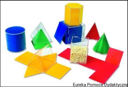 Zestaw 8 otwieranych brył geometrycznych wykonanych z przeźroczystego tworzywa. Wszystkie bryły można napełniać płynem lub materiałem sypkim w celu porównywania objętości. Wszystkie posiadają kolorowe siatki, które wsuwa się w środek brył. Siatki nie są klejone składają się tylko z jednej części, posiadają wyżłobione linie zgięcia, boki natomiast są złamane. Dzięki temu, bryła się nie rozkleja.