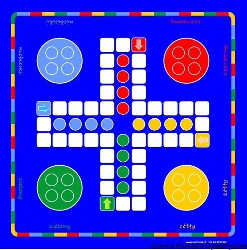 Duża plansza do gry w "Chińczyka" na trwałej macie PCV z kompletem ekologicznych, drewnianych pionów + drewniana kostka.