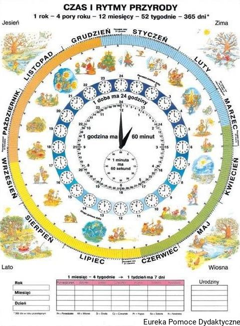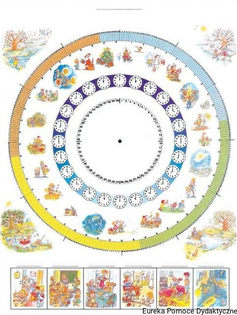 Magnetyczna plansza z ruchomymi elementami pozwoli zrozumieć dzieciom pojęcie czasu i jego upływ. W zestawie znajdują się kartoniki z ilustracjami czynności charakterystycznych dla różnych pór dnia. Dzieci mogą szeregować obrazki w górnej części tablicy lub umieszczać na obwodzie tarczy zegara. Wszystkie elementy są z grubego kartonu do podklejenia magnesami, co czyni manipulowanie na planszy bardzo wygodnym.