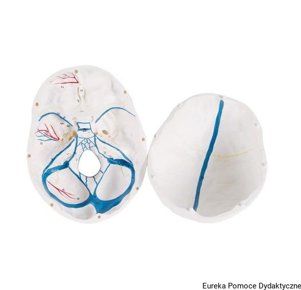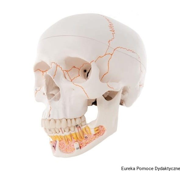 Czaszka z otwieraną dolną szczęką i widocznymi korzeniami z naczyniami krwionośnymi i nerwami. Kości czaszkowe, szczeliny, otwory i inne struktury są numerowane. Szwy czaszkowe zaprezentowane zostały w kolorze, jak również naczynia oponowe i zatoki żylne.