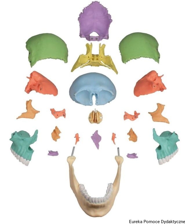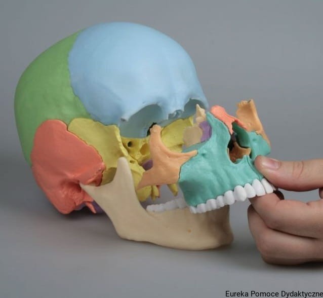 Czaszka osteopatyczna dorosłego człowieka z możliwością rozłożenia na poszczególne kości. Kości są w indywidualnych kolorach, wyposażone w magnetyczne łączniki umożliwiające złożenie całej czaszki.