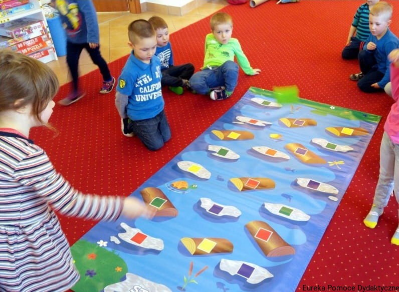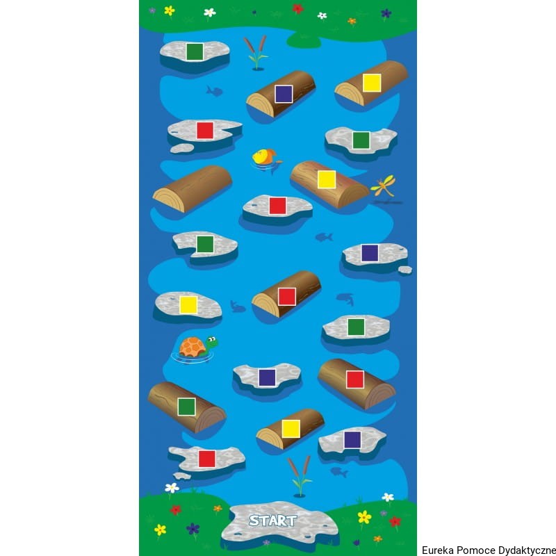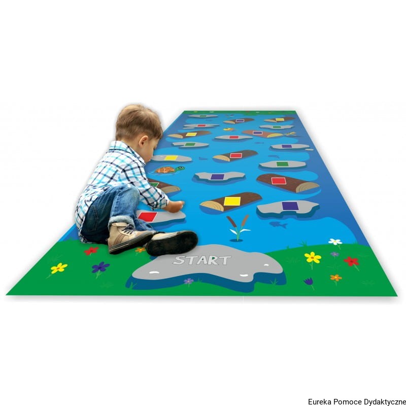 Duża mata edukacyjna – Rzeczka przygotowana jest z myślą o rozwoju umiejętności poznawczych dziecka. Dzieci rozwijają umiejętności związane z integracją sensoryczną oraz ćwiczą umiejętności dostosowania się do sytuacji niestandardowych. Dodatkowo rozwijają umiejętności nazywania i rozróżniania kolorów. Uniwersalna forma maty pozwala na tworzenie wielu modyfikacji zabaw. Można stworzyć własne zasady gier, które pomogą dziecku zrozumieć otaczającą go rzeczywistość lub ułatwią odbiór wiedzy, z którą dziecko musi się zmierzyć w konkretnej fazie rozwojowej. Poniżej przedstawione są przykładowe zabawy edukacyjne, w których dziecko może uczestniczyć zarówno w przedszkolu wraz z większą ilością dzieci, jak i w domu bawiąc się z rodzeństwem lub rodzicami.