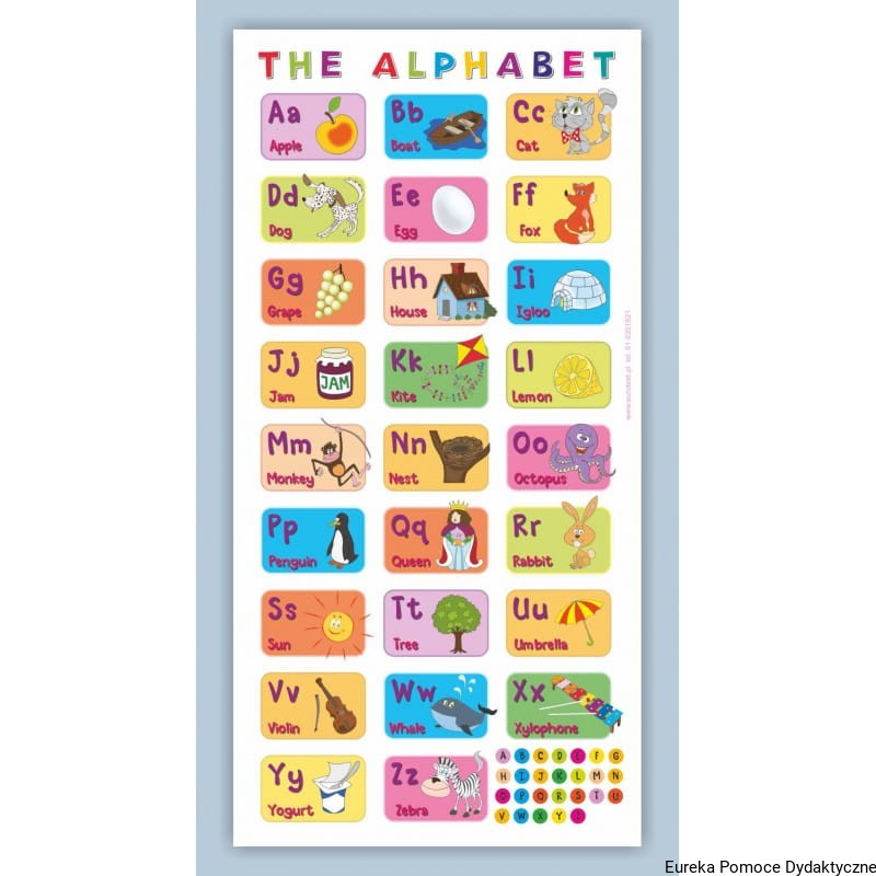 Kolorowa, duża mata do nauki alfabetu języka angielskiego, wykonana z wytrzymałej, antypoślizgowej, grubej folii PCV. Z maty można korzystać zarówno w sali przedszkolnej jak i na trawniku. Po rozłożeniu mata ma wymiary 1 x 2 m.