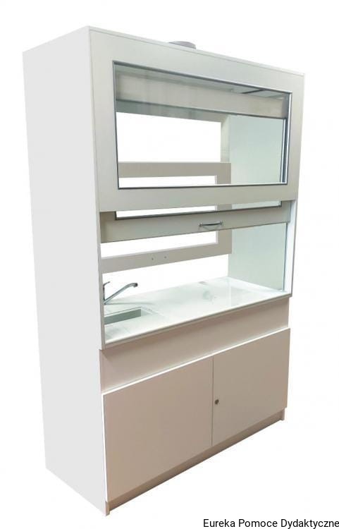 W górnej komorze zamocowana jest przesuwana okiennica podnoszona za pomocą systemu „Fennel”. Pozwala on na ustawienie okiennicy (góra-dół) w dowolnym położeniu. Wentylator z płytą montażową stanowi wyodrębnioną część wyciągu do montażu na otworze kominowym. W standardzie wentylator kanałowy o mocy 350-500 m3/h dwubiegowy. Instalacja wyciągowa wykonana jest z polistyrenu w wersji podstawowej. Króciec wyciągowy na suficie fi 150mm. Dygestorium posiada system wentylacji wywiewny. W wersji wzbogaconej fragment instalacji wyciągowej narażonej na bezpośrednie działanie oparów szkodliwych jest wykonana z kształtek i kanałów kwasoodpornych. Całość na nośniku płyty laminowanej. Nóżki regulacyjne niewidoczne z zewnątrz, umożliwiają wypoziomowanie urządzenia.