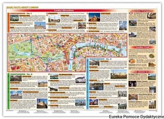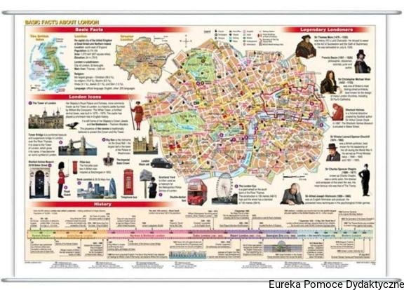 Obok mapy Wielkiej Brytanii znajduje się szczegółowa mapa Londynu oraz tematy takie jak ikony Londynu, legendarni londyńczycy i krótki przegląd historii tego słynnego miasta.