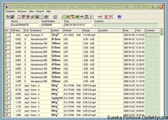 Pamięć wyników (logger): 999 rekordów (pojedynczy rekord składa się z następujących pól: wynik, jednostka pomiaru, nazwa substancji, symbol chemiczny substancji, metodyka pomiarowa, numer katalogowy odczynników, czas i data wykonania pomiaru, miejsce wykonania pomiaru, osoba wykonująca pomiar)