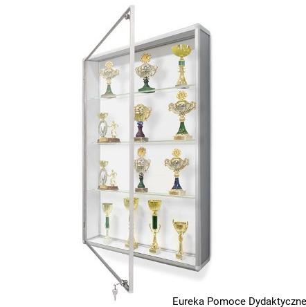 Gablota na puchary GPB otwierana na bok. Wykonana z anodowanych profili aluminiowych, narożniki plastikowe. Drzwi bezpieczne szkło akrylowe w ramie aluminiowej, zamykane na dwa zamki. W zestawie trzy półki z grubego szkła szlifowanego w trzech płaszczyznach z możliwością regulacji wysokości. Ściana tylna biała.