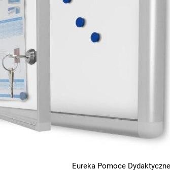 Gablota ogłoszeniowa GMR 50 x 70 cm wykonana z bezpiecznego szkła akrylowego. Rama gabloty aluminiowa anodowana w kolorze srebrnym, narożniki plastikowe. Drzwi uchylne zamykane na dwa zamki.