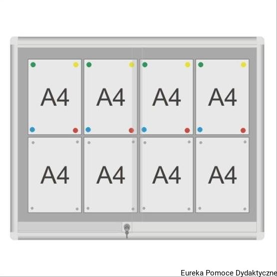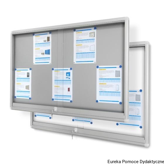 Gablota ogłoszeniowa z drzwiami przesuwnymi. Wykonana z owalnych profili aluminiowych anodowanych. Narożniki plastikowe. Drzwi przesuwane w prowadnicach na rolkach mosiężnych, zamykane na zamek patentowy.