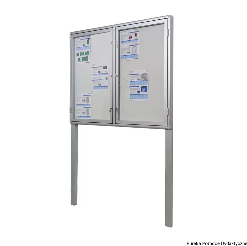 Gablota zewnętrzna wolnostojąca dwudrzwiowa VCD-WL przeznaczona jest do prezentowania między innymi ogłoszeń, informacji czy plakatów. Gablota wyposażona jest w uszczelki zapobiegające przedostawaniu się wody. Drzwi gabloty osadzone są na mocnych zawiasach aluminiowych ze stalowym rdzeniem. W drzwiach zamontowane są zamki i uchwyty do otwierania gabloty oraz przeszklenie wykonane z litego poliwęglanu. Gablota przykręcana jest do solidnych nóg z profili aluminiowych odpornych na korozje o przekroju 60 x 40 mm o długości 250 cm z czego 50 cm należy zabetonować w gruncie. Informacje w gablotach zewnętrznych mocuje się za pomocą magnesów, najlepiej neodymowych. Gabloty produkowane są z aluminium anodowanego na srebrno. Narożniki łączące profile wykonane są z tworzywa ABS. Gablota jest doskonale chroniona przed kradzieżą dzięki zastosowaniu krytego montażu wewnętrznego - zapewniając jednocześnie właściwą estetykę produktu. Materiały użyte do produkcji gablot zewnętrznych spełniają wymagane dla nich normy.