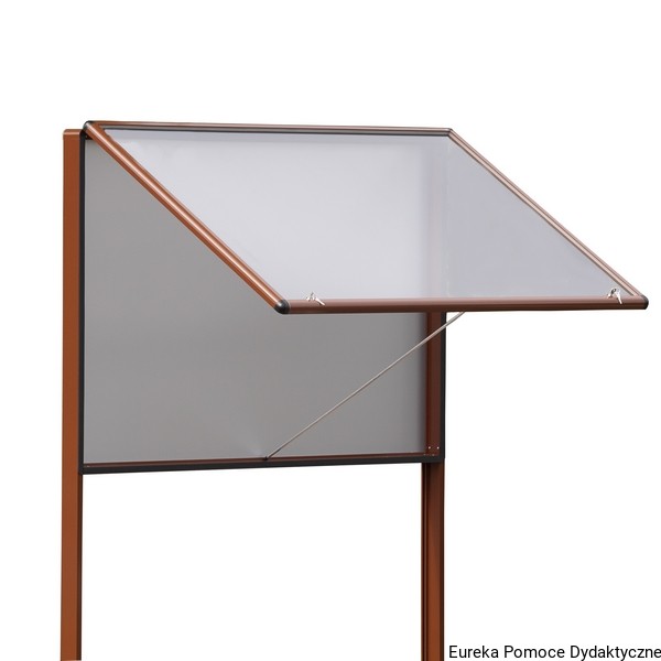 Gablota ogłoszeniowa zewnętrzna wolnostojąca GOZ-WL. Wykonana w całości z aluminium anodowanego lub malowanego proszkowo. Dodatkowo nogi gabloty wykonane z jednolitego profilu aluminiowego, znacząco wzmacniającego konstrukcję gabloty. Szyba w gablocie z bezpiecznego szkła akrylowego. Drzwi otwierane do góry zabezpieczone uszczelką zapobiegającą przedostawaniu się wody, zamykane na dwa zamki. Nogi gabloty należy zabetonować w podłożu.