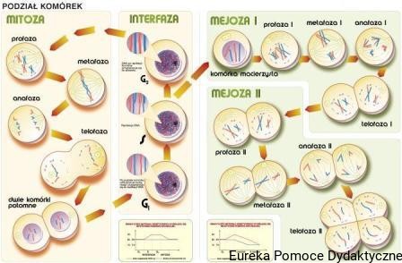 Zamieszczone na jednej tablicy rysunki przedstawiające podziały komórkowe (mitozę i mejozę) pozwalają na porównanie tych dwóch procesów i wykazanie różnic.
