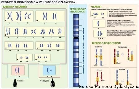 W ciekawy sposób przedstawiono kariotyp człowieka. Odpowiednie ułożenie chromosomów i zastosowanie dwóch barw do wyróżniania płci, ułatwia słuchaczom zrozumienie i kojarzenie podstawowych cech różniących zestawy chromosomów kobiety i mężczyzny. W prosty i przystępny sposób przedstawiono mutacje chromosomów, sprawiające słuchaczom nieco kłopotu z powodu zapamiętywania trudnych pojęć.