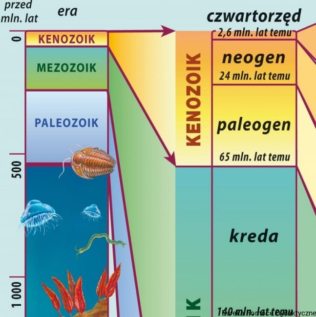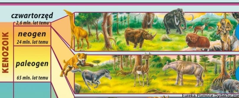 Plansza zawiera informacje o ważnych etapach w historii geologicznej Ziemi, istnieniu różnych grup zwierząt i roślin, ich pojawienie się i zniknięcie aż po obecną formę krajobrazu i życia.