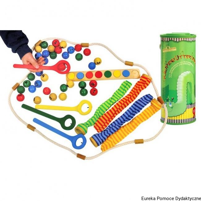 Mogą również tworzyć zbiory, proste działania matematyczne (np. zbierają 5 ale również sumę tworzącą 5 czyli 2 i 3 lub 4 i 1 ). Dzieci ćwiczą szybkość ruchów ręki, prawidłowe trzymanie łyżki przygotowując się do nauki pisania. Prawidłowość wykonania zadania dzieci sprawdzają wyciskając kulki drugą stroną gąsienicy, zakończoną gumką. Ćwiczy mięśnie śródręcza prawej i lewej ręki. Bambusowe łyżki i kulki angażują gracza w wykonywanie wielu czynności równocześnie.