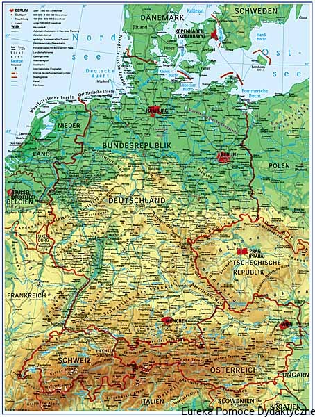 Ścienna mapa szkolna przedstawiająca kraje niemieckojęzyczne, ich ukształtowanie powierzchni oraz wewnętrzny podział Niemiec na kraje związkowe (landy). Dodatkowo w kartonach bocznych znajdują się podstawowe informacje statystyczne dotyczące poszczególnych krain.