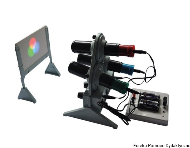 Symulator w postaci mini projektora wykorzystującego trzy niezależne źródła światła (czerwone, zielone, niebieskie) umiejscowione w trzech ruchomych obudowach, pozwalających na regulację konta padania światła na biały ekran.