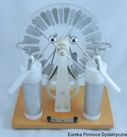 Maszyna elektrostatyczne składa się z dwóch tarcz izolacyjnych, które za pomocą korbki i odpowiedniej przekładni obracamy w przeciwnych kierunkach. Na zewnętrznej stronie tarczy są nałożone aluminiowe segmenty. Na osi obrotu tarcz z obu stron są umocowane metalowe pręty, zaopatrzone na końcach w metalowe szczotki, które dotykają segmentów aluminiowych. Na wysokości poziomej średnicy tarcz są umocowane zgięte pręty, opatrzone ostrzami (tzw., grzebieniami), które są zwrócone do obu tarcz, ale nie dotykają ich. Ostrza te zbierają ładunki, które są doprowadzone do iskiernika. Iskiernik stanowią dwie kulki na prętach metalowych opatrzonych ebonitowymi uchwytami. Kulki iskiernika są połączone z dwiema wewnętrznymi okładkami butelki lejdejskiej. Okładki zewnętrzne tych butelek są połączone prętem poziomym. Podczas obracania tarczy powstają ładunki, które są zbierane przez grzebienie i między iskiernikami powstaje duża różnica potencjałów, co powoduje przeskok iskry.