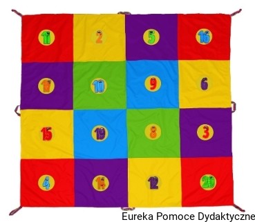 Chusta edukacyjna tak jak klasyczna chusta animacyjna składa się z 12 kolorowych klinów, ale dodatkowo na każdym klinie znajdują się rzepy, do których można przyczepiać dołączone do zestawu elementy.