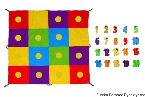 Mata Edukacyjna składa się z 16 kolorowych kwadratów o wymiarach 50 x 50 cm. Dodatkowo na każdym kwadracie znajduje się rzep w kształcie koła o średnicy 15 cm. Rzepy można wykorzystać w zabawie z matą przyczepiając do niej dodatkowe elementy lub w innych zabawach ruchowych (twister, gra w klasy, rzut do celu i wiele wiele innych).
