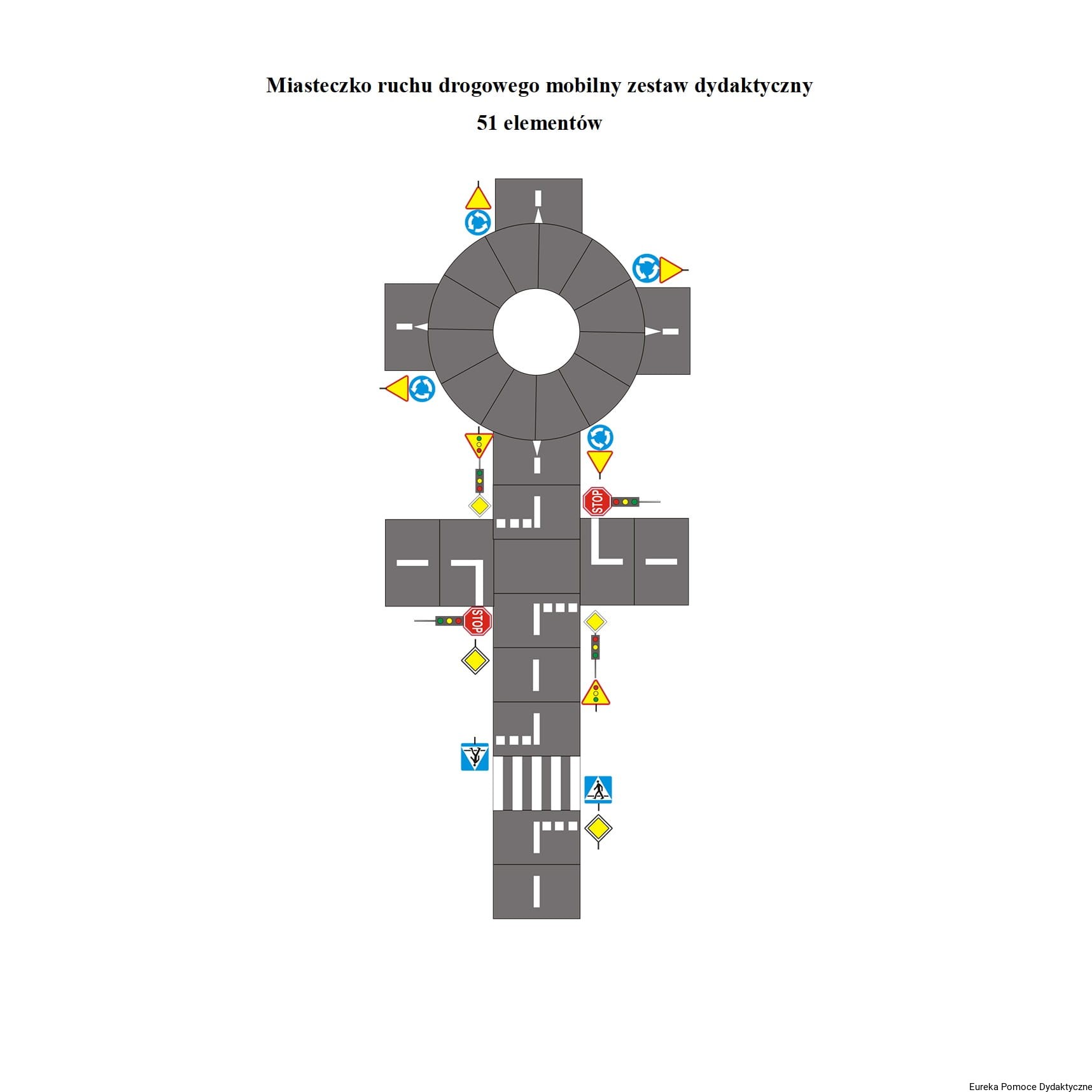 Wszystkie elementy powyższych zestawów są ze sobą w pełni kompatybilne. Wykonanie z atestowanych materiałów (guma 5 mm oraz utwardzone PCV) gwarantuje długą żywotność miasteczka nawet przy intensywnym użytkowaniu w placówkach oświatowych.