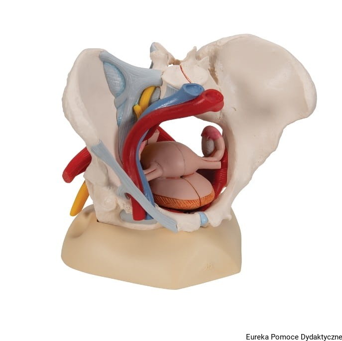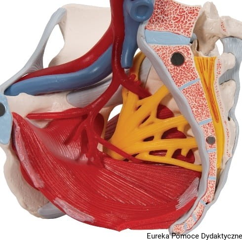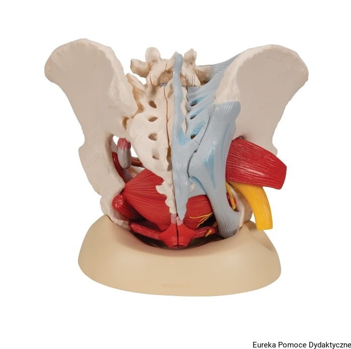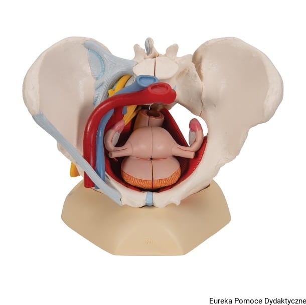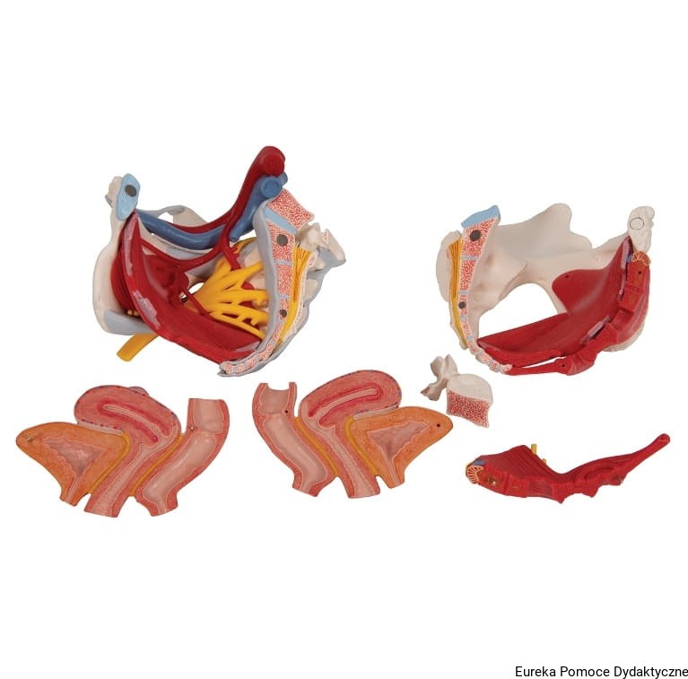 Sześcioczęściowy model żeńskiej miednicy przedstawia szczegółową informację na temat budowy kości, więzadeł, naczyń, nerwów, mięśni dna miednicy i żeńskich organów.