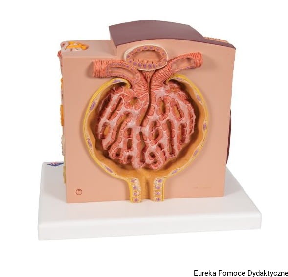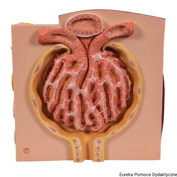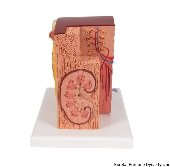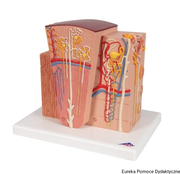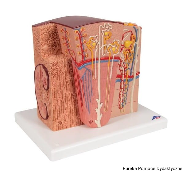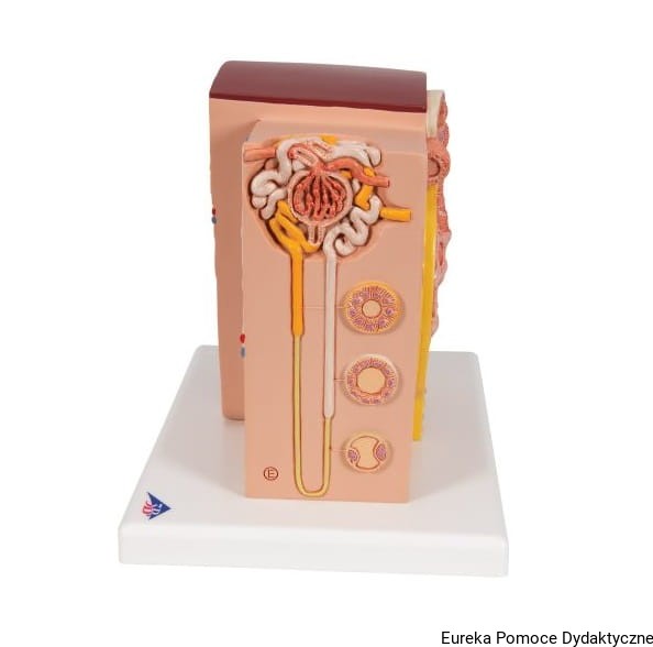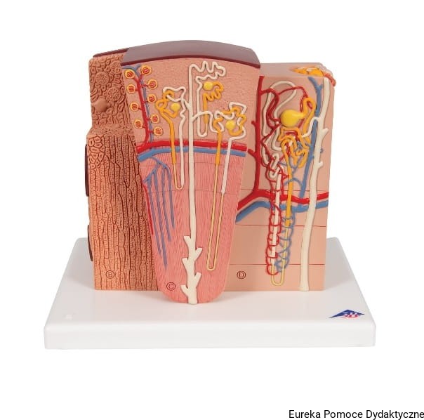 Mikroanatomiczny model nerki przedstawia w sposób niezwykle szczegółowy morfologiczne/funkcjonalne elementy budowy nerki. Struktury budowy anatomicznej nerki są przedstawione w dużym powiększeniu.