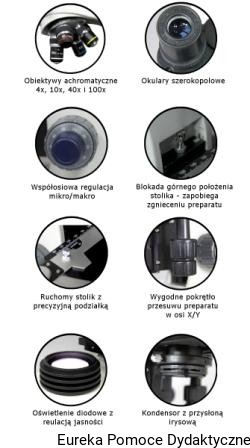 Bardzo dobra optyka z obiektywami achromatycznymi 4x, 10x, 40x (amortyzowany) i 100x (amortyzowany i immersyjny). W zestawie standardowym mikroskop oferuje powiększenia 40x, 100x, 400x oraz 1000x.
