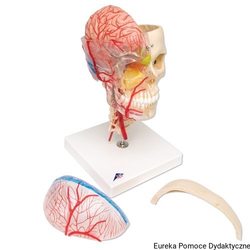 - Układ naczyniowy: wyraźnie zaznaczone tętnice szyi i twarzy (czerwone) oraz zatoki opony twardej (niebieskie).