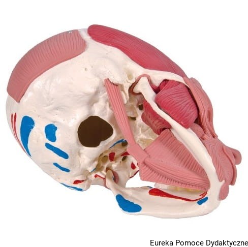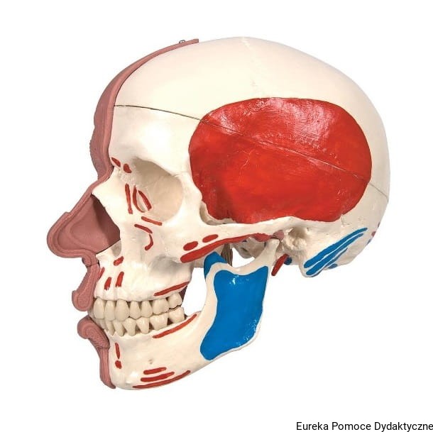 Na prawej połowie czaszki przedstawiono mięśnie twarzy i żwaczowe, które są rozróżnione innym odcieniem koloru. Na lewej połowie czaszki oznaczono miejsca przyczepów początkowych i końcowych mięśni (kolor czerwony i niebieski). Żuchwa jest ruchoma a dzięki elastycznym mięśniom można zademonstrować podstawowe ruchy żucia. Pokrywa czaszki i mięsień żwacz są demontowalne.