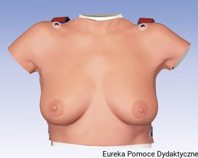 Przedstawia odlew oryginalnej kobiecej klatki piersiowej z średniego rozmiaru piersiami. Do demonstracji badania piersi, w pozycji leżącej należy położyć model na załączonej podstawie (można przeciągnąć i zapiąć paski do zawieszania pod podstawką). Paski do zawieszania pozwalają na naukę i ćwiczenia praktycznego badania piersi na sobie w pozycji stojącej. Są przedstawione zmiany patologiczne: guzy o różnym stopniu zaawansowania, 'skórka pomarańczy', powiększone węzły chłonne.