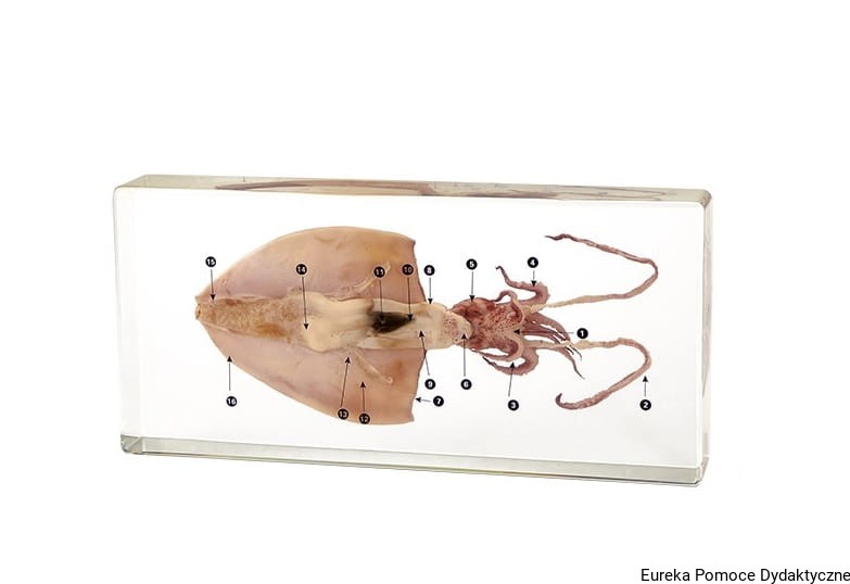 Model przedstawia preparowane ciało kałamarnicy po sekcji zatopione w akrylu.