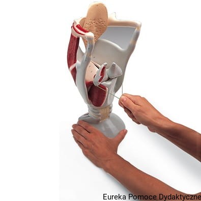 Model przedstawia w 4-krotnym powiększeniu krtań z kością gnykową. Z prawej strony widoczne są struktury chrząstkowe, a z lewej mięśniowe. Struny głosowe, chrząstki nalewkowate oraz nagłośnia są ruchome w celu demonstracji ich funkcjonowania.