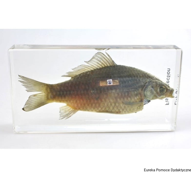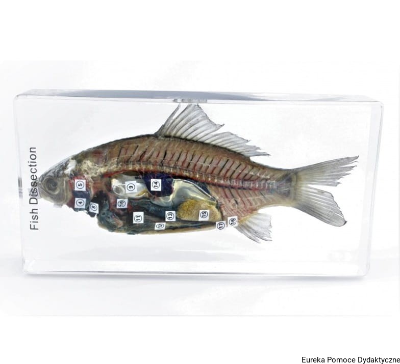 Model przedstawia preparowane ciało ryby po sekcji zatopione w akrylu.