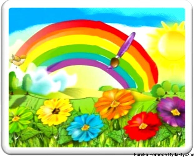 Na ekranie wyświetla się piękna łąka, na której rosną kolorowe kwiaty. Zadaniem dziecka jest pokolorowanie tęczy kolorami z kwiatów w odpowiedniej kolejności