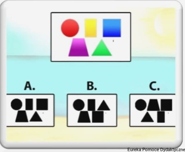 Na środku ekranu znajduje się prosty obrazek wykonany z kolorowych figur geometrycznych oraz trzy miniaturki, z których jedna jest odwzorowaniem kształtów obrazka głównego. Zadanie polega na prawidłowym wskazaniu miniaturki obrazka wzorcowego.