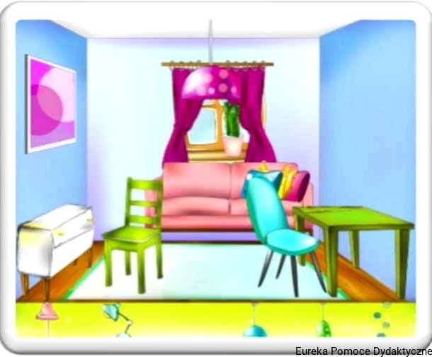 Na planszy wyświetla się ładnie urządzony pokój. W pomieszczeniu umieszczone są różne przedmioty. Zadaniem dziecka jest określenie czy dany przedmiot jest blisko czy daleko. Gra, która