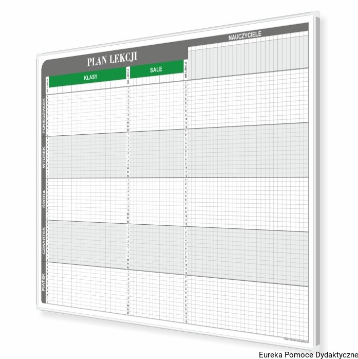 Do układania planu służą kolorowe znaczniki magnetyczne po 60 sztuk dla każdego nauczyciela. Tablica podzielona jest na 3 części. W pierwszej części od lewej strony mamy klasy/odziały szkolne z możliwością podziału na dwie grupy. W drugiej części znajdują się sale lekcyjne, a w ostatniej nauczyciele. Nad nazwiskiem nauczyciela, które wpisuję się markerem do tablic suchościeralnych jest pole do umieszczenia znacznika magnetyczne przypisanego do nauczyciela. Ilość godzin w dniu 12. Tablica oprawiona w ramę aluminiową srebrną z narożnikami z tworzywa. Nadruk wykonany w technologii uniemożliwiające jego usunięcie. Produkt wysokiej jakości.