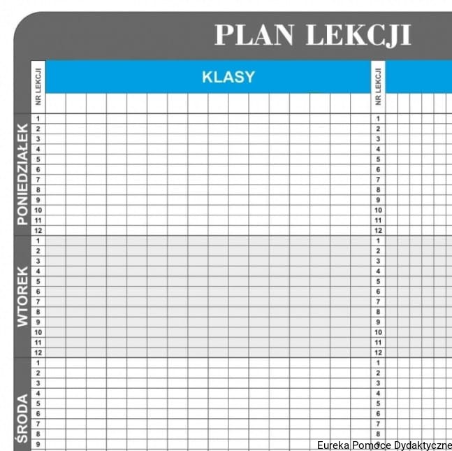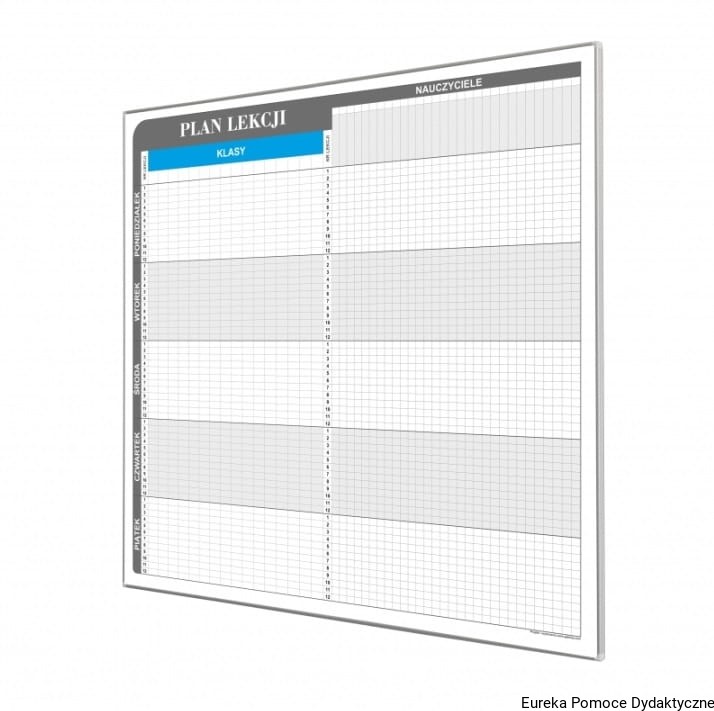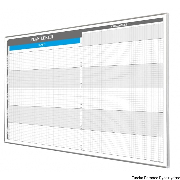 Tablica do układania planu lekcji z możliwością pisania markerami suchościeralnymi. Oprawiona w ramę aluminiową anodowaną.