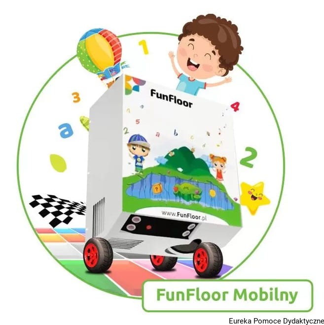 FunFloor w wersji mobilnej można zamontować na bezpiecznym stabilnym statywie z gumowymi kółkami albo przymocować na stałe do ściany. Dzięki zastosowaniu szerokokątnego projektora obraz wielkości 270 x 200 cm uzyskujemy z wysokości 185 cm. FunFloor Mobilny zawiera 210 gier, wyposażony jest w 4 pakiety gier FUN (50 gier), EDU (50 gier), EKOLOGIA (10 gier) oraz JĘZYK ANGIELSKI (100 gier).