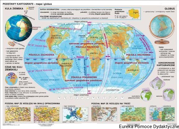 Podstawowe wiadomości na temat siatki geograficznej, odwzorowań kartograficznych, podziału map oraz czasu na Kuli Ziemskiej.