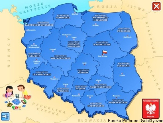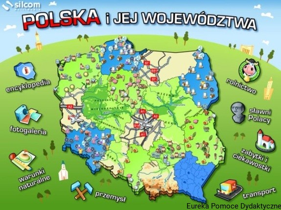 W części edukacyjnej użytkownicy zapoznają się z ogólną charakterystyką i danymi statystycznymi dotyczącymi poszczególnych województw oraz z informacjami na temat warunków przyrodniczych, przemysłu, rolnictwa. Poznają sławnych Polaków związanych z poszczególnymi województwami, a także zabytki i ciekawe miejsca. Służą temu atrakcyjne pod względem graficznym mapki przedstawiające góry, niziny, rzeki, miasta, węzły komunikacyjne, zabytki itp.