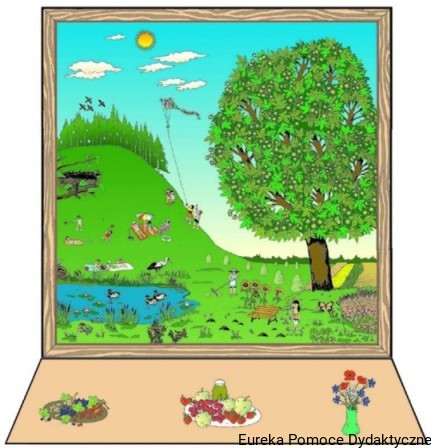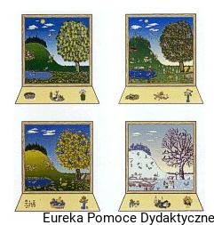 Pomoc przedstawia widok z okna o każdej porze roku, który zawiera stałe elementy krajobrazu: drzewo (kasztanowiec), staw, wzgórze, ławkę i w oddali las. Zmienia się jedynie szata roślinna, barwy, przedstawione postacie wykonują różne czynności, ubrane są w inne stroje. Widoczne są różne gatunki zwierząt, zmienia się kolor nieba. Pomoc została opracowana w taki sposób, aby każda z plansz mogła zostać wykorzystana oddzielnie i dała możliwość szerokiego omówienia wielu zagadnień związanych z porami roku. Plansze można prezentować równocześnie, porównując elementy krajobrazu, zwracając uwagę na występujące różnice. Mogą stanowić pomoc podczas realizacji zagadnień z zakresu edukacji przyrodniczej: rozumienie, jak i dlaczego przyroda przystosowuje się do określonej pory roku, dostrzeganie cech charakterystycznych dla danej pory roku, poznanie niektórych zwierząt, dobieranie odpowiedniego stroju do pogody. Stwarza okazję do swobodnych wypowiedzi, wzbogacania słownictwa i pogłębiania wiedzy o otaczającym świecie.