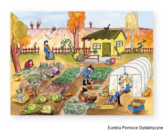 Składa się z trzech dużych ilustracji przedstawiających zbieranie warzyw na działce, zwożenie plonów z działki do domu, półki w piwnicy z umieszczonymi zbiorami z działki.