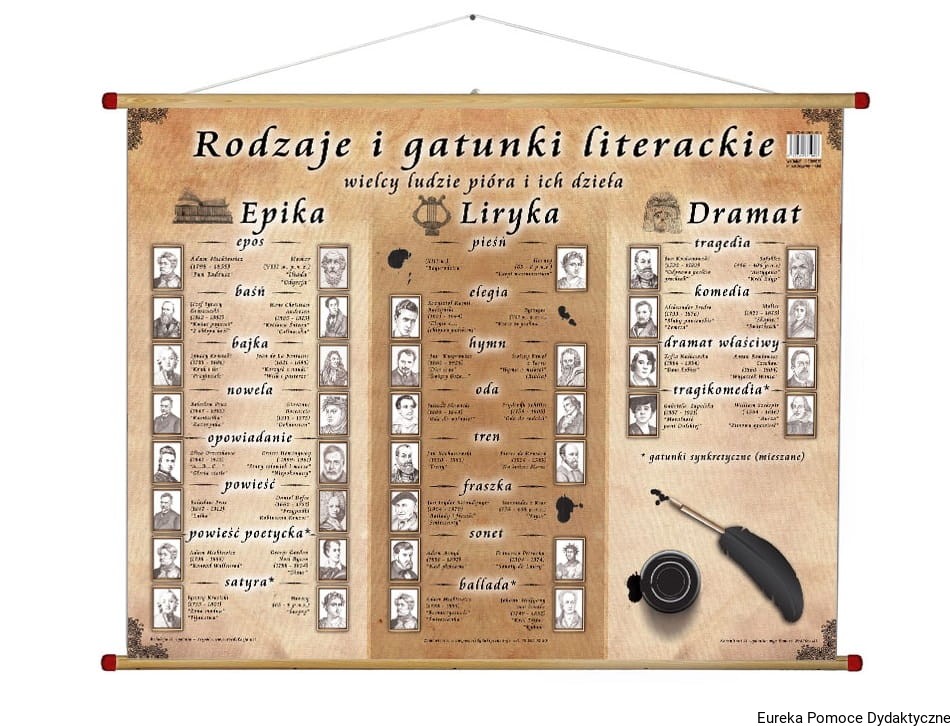 Rodzaje i gatunki literackie to wielkoformatowa, jednostronna plansza prezentująca znany z gabinetów polonistycznych podział utworów literackich w sposób atrakcyjny i jednocześnie stylowo zwizualizowany w kilku uzupełniających się płaszczyznach postrzegania.