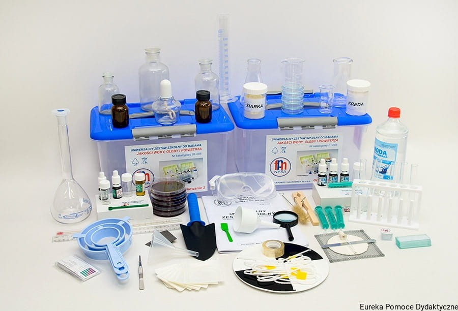 Bogate wyposażenie zestawu w sprzęt laboratoryjny (szklany) i środki pomocnicze umożliwia przeprowadzenie testów wody, gleby i powietrza.