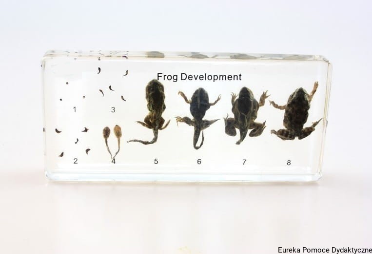 Model przedstawia proces rozwoju żaby zatopionej w akrylu: