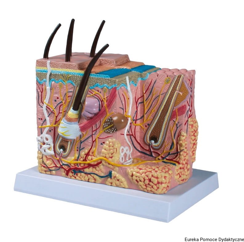 Model przekroju skóry ludzkiej i struktur wewnętrznych w około 50–krotnym powiększeniu. Przedstawiono różne warstwy skórne i struktury anatomiczne. Ponadto widoczne są nerwy, naczynia krwionośne, gruczoły łojowe i potowe, mieszki włosowe oraz mięsień prostownik włosa, ciałko Paciniego i inne elementy budowy anatomicznej.